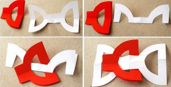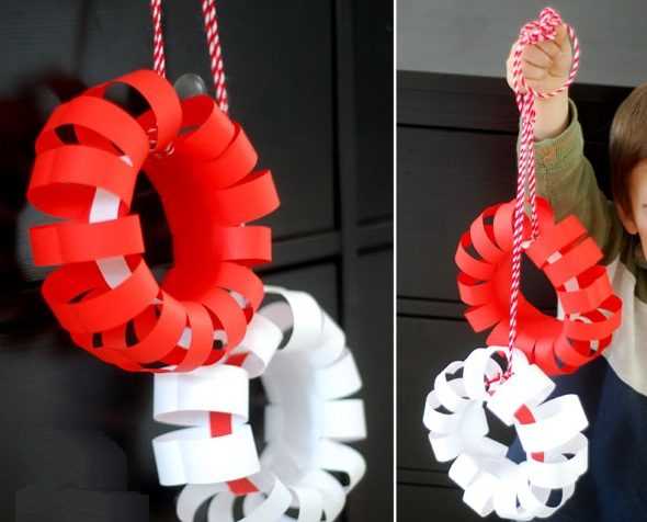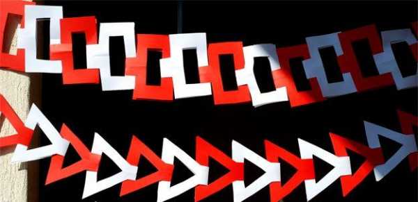Эти украшения делаются очень просто и быстро своими руками. Вам понадобится два листа А4 — красного и белого цвета, ножницы и клей-карандаш. Если Вы хотите сделать много украшений, то берите больше бумаги, главное, чтобы оба цвета были в одинаковом количестве.