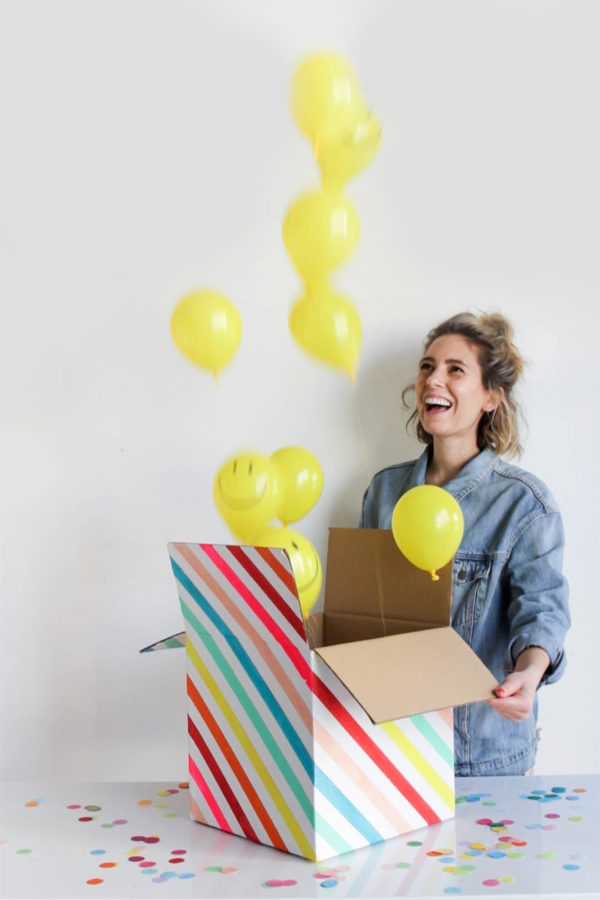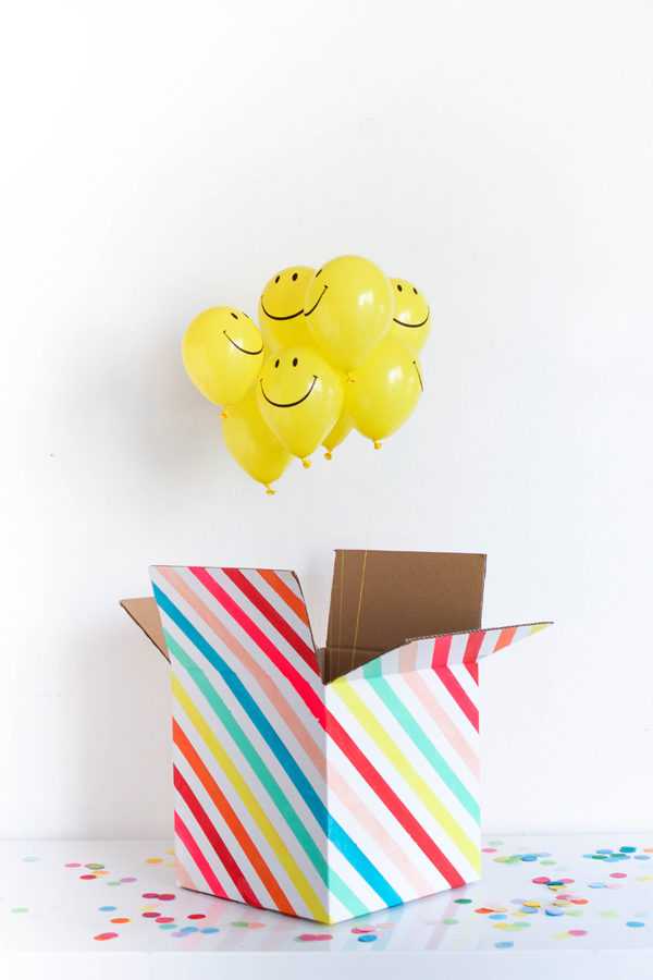 - Поместите в коробку маленькие гелиевые шарики (количество зависит от размера коробки. Концы ленточек, привязанных к шарикам, можно прикрепить ко дну коробки, если Вы хотите, чтобы шарики выскочили на длину ленточки при открытие коробки, или же не крепить, если Вы хотите, чтобы они эффектно улетели к потолку или в небо.