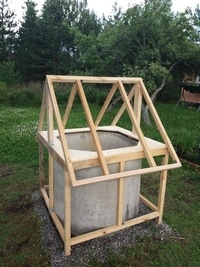 - Каркас конструкции. Его начинают возводить после измерения диаметра колодца из бетонных колец – это станет расстоянием между сторонами каркаса. Если колодец прямоугольный или квадратный, домик будет являться продолжением стенок. Из бруса сечением 80*100 мм делают раму-основание. Если домик возводится от земли, а не от верхнего кольца, то необходимо сделать две одинаковые рамы-основания, которые скрепляются между собой с помощью 4 стоек из бруса. Лучше использовать гвозди длиной не менее 100 мм, чтобы они прочно скрепляли между собой все детали конструкции. Из центра верхней рамы-основания возводят две стойки из бруса, высота которых станет высотой домика. Далее устанавливают стропила из бруса, обрезая торцы брусков под углом 45° и делая вырезы в тех местах, где стропила будут соединяться с верхней рамой-основанием. Для прочности крыши устанавливают ригели и укосины. В каркасе обязательно нужно предусмотреть дверцу, причем она может быть и на боковых стенках крыши (если в колодце не предусмотрен ворот), и на самих скатах. Для дверцы необходимо установить два бруса параллельно стропилам и два бруса горизонтально.