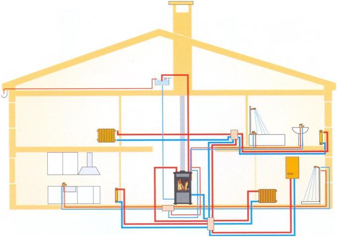 Для печного отопления в доме с водяным контуром, как правило, предполагается расположение печи в центральном участке в доме и таким образом, чтобы топка выходила, например, на кухню либо иное нежилое помещение, а корпус ж е должен находится именно в жилом помещении. Такое размещение позволяет обогревать одновременно несколько комнат эффективно