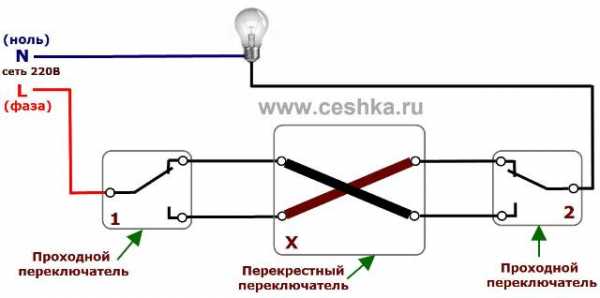 Перекрестный переключатель обозначен буквой икс (Х). Работа схемы обозначена по аналогии с вышеописанной схемой проходных выключателей.