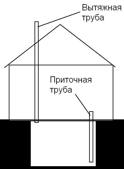 Это традиционный вариант устройства вентиляции погреба путем естественного воздухообмена. Важный момент: две трубы системы должны находиться в разных углах погреба. Один из них будет отвечать за приток свежего воздуха, а второй – за его вытяжку. Для обеспечения максимальной эффективности оборота воздуха, конец приточной трубы размещается на расстоянии от 20–50 см от пола.