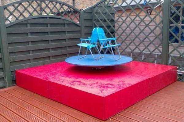 Состоит она из старой автомобильной покрышки, заполненной бетоном и арматуры, на которую и крепится карусель.