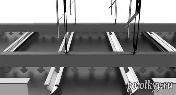 На подвесы фиксируются направляющие рейки-стрингеры. Их необходимо делать примерно на 1 см короче длины стен, чтобы компенсировать возможное тепловое расширение. Чтобы направляющие были ровными, нужно натянуть перпендикулярно им направляющую капроновую нить или приложить снизу строительное правило.