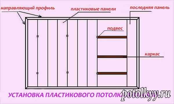 Как уже говорилось выше, процесс монтажа пластиковых панелей не имеет ничего общего с изготовлением алюминиево–реечной конструкции и всё сходство процессов заканчивается этапе на нахождении самой низкой точки помещения. Тут действительно технология аналогична вышеописанной.
