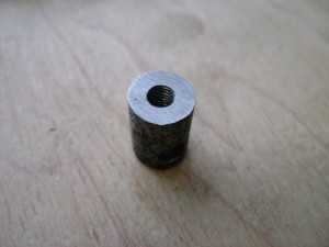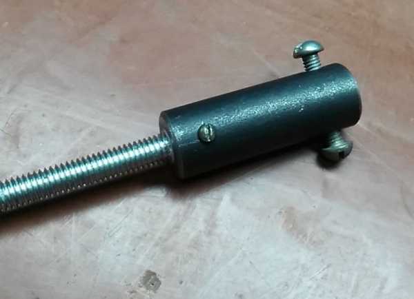 Далее самое сложное — изготовление оси Z. Так как мебельные направляющие слишком большие, пришлось делать вручную. Тоже прикинув все в голове, приступил к изготовлению. Начал с «бочонков» которые бы ездили по направляющим. В бочонке есть 2 отверстия: одно с резьбой для закрепления, другое сквозное через которое будет проходить направляющая. В роли направляющих использовал тягу от какого-то грузового автомобиля (прочная штука, резьбу с трудом нарезал).