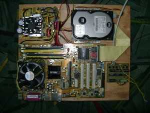 Еще с самого начала я задумал для станка использовать отдельный компьютер, а точнее материнскую плату которая была куплена в интернете за 200грн (~25$). Так же еще перед тем как начать строить станок я задумал всю электронику поместить внутрь станка. Для этого и был сделан такой «ящик». Блок питания использовался естественно компьютерный который был изъят из корпуса и которому были укорочены провода. Купил жесткий диск на 3Гб, больше и не требуется, лишь бы винда влезла (которая у меня урезанная и весит ~300мБ). Все это дело было размещено на дне станка: