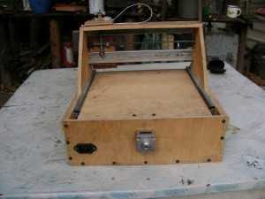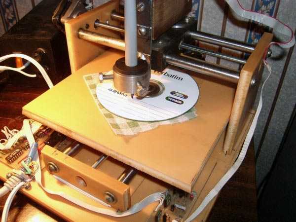 Фото уже готового и рабочего станка. На заднюю стенку выведен разъем питания, шлейф для двигателя по оси Z взят от DVD плеера. Двигателя осей Z,Y соединены в один кабель и соединения закрыты коробочкой: