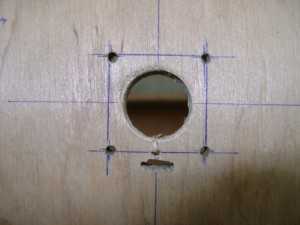 3.3 Держатели подшипников линейного перемещения забиваются в пазы детали подвижного стола. Соединение типа шип-паз обеспечивает отличную жесткость узла, все детали этого узла изготовлены из фанеры 18мм. Дополнительно стянув детали болтовым соединением обеспечим долгий и надежный срок службы, для этого через уже имеющееся отверстие в пластине, которое служит направляющим для хода сверла, сверлим отверстие в торце держателя линейных подшипников, как показано на рисунке 3, сверло диаметром 4мм.