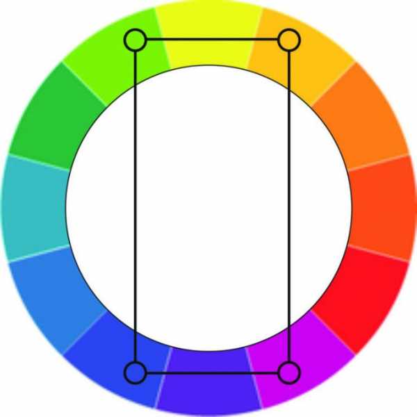 Схема подбора с квадратомСмысл состоит в том, что берется за основу каждый третий цвет в круге. Второй способ заключается в том, что берется за основу вписанный прямоугольник. Берутся за основу нижняя пара цветов, через один и по такому же принципу к ним подбираются контрастные.
