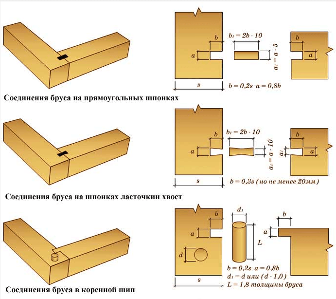 Методики применяются субъективно, исходя из проекта. Вставной шип должен быть тверже, чем дерево бруса.