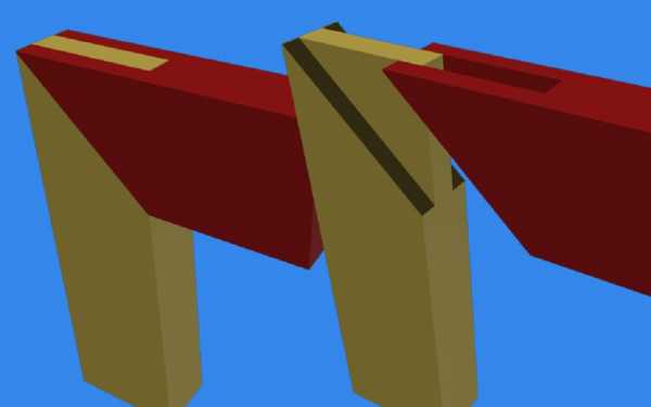 Первый вариант замка сильно напоминает соединение в половину дерева. Но скосы на торцах существенно меняют его свойства. В результате, увеличенная нагрузка на сжатие только усиливает конструкцию.