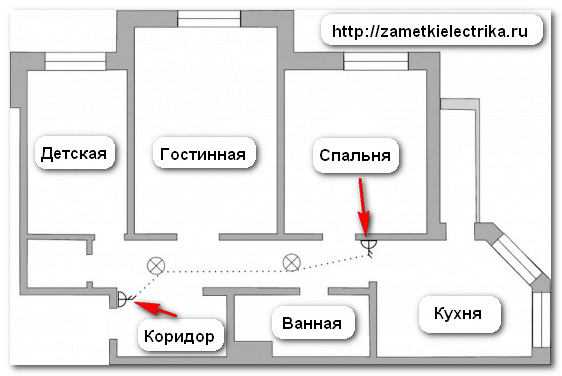 В определенных случаях возникает необходимость обеспечить не два, а более пунктов управления светильниками. Например, свет на лестнице многоэтажного дома должен включаться и выключаться на каждом этаже. Та же ситуация с длинным коридором, в который выходят двери нескольких комнат.