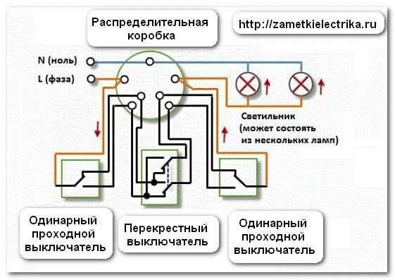 Проходной выключатель схема подключения — управление светильником из 3 мест