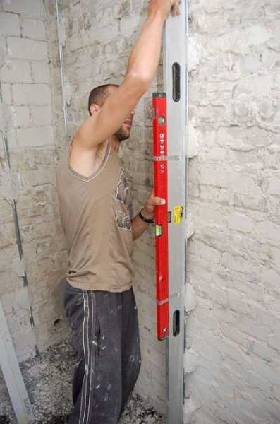 - Первым делом нарезают маячковые профили. Они должны быть на 30 см короче высоты потолков в квартире.