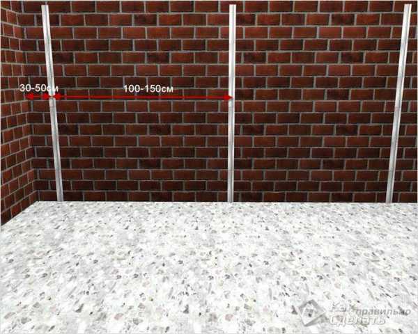 Чтобы определить, какое количество маячков требуется для стен, поделите условно стену на вертикальные полосы, шириной по 1,5м. По этим полосам и будем устанавливать маяки.