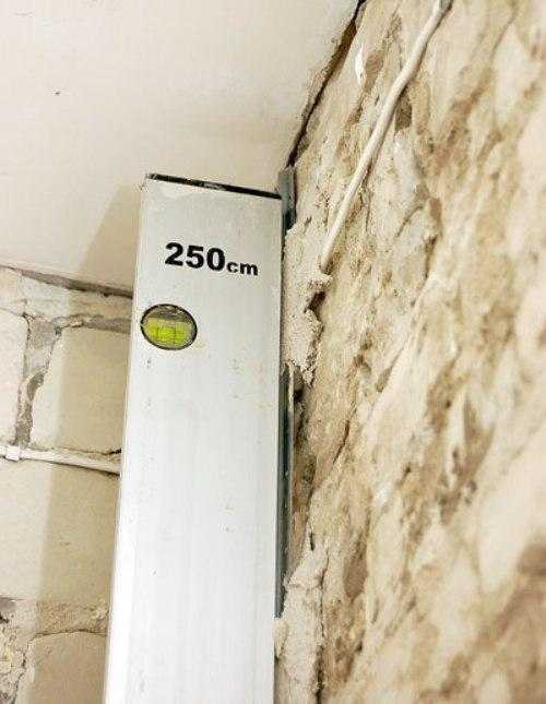 - От угла отступают 30 см, от потолка и пола по 15 см, после этого чертят строго вертикальную линию с помощью маркера и строительного уровня.