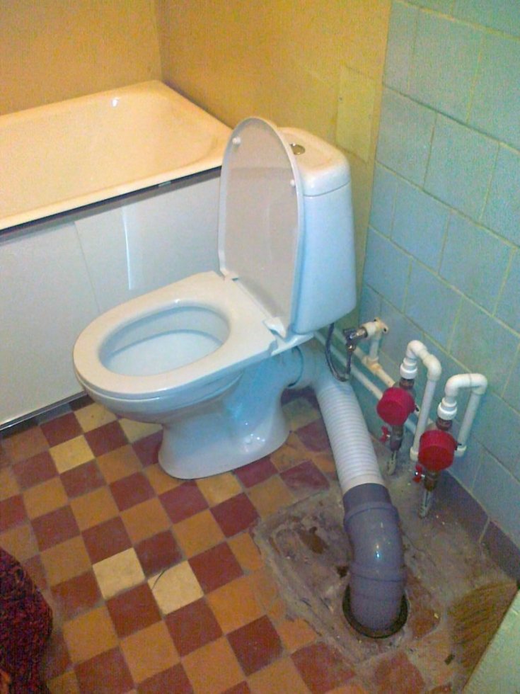 Если пол поднялся на толщину только что уложенного кафеля, выпуск унитаза может — либо оказаться выше раструба, либо слишком выдвинуться вперед.