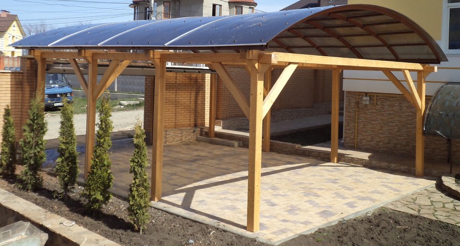 Он возводится на нескольких опорах, которые устанавливаются по его периметру. Но на такой конструкции в зимнее время года будет собираться слой снега, что увеличит нагрузку и конструкция может не выдержать, если соорудить деревянный каркас с кровлей из поликарбоната.