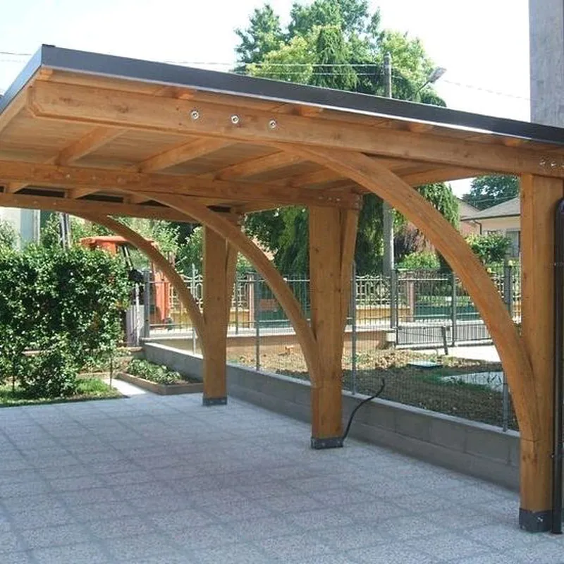 - Стационарные навесы. Эти конструкции располагаются недалеко от основного строения, так как служат альтернативой гаражу или хранилищу для разных предметов и материалов. Вполне возможно возведение отдельно стоящих навесов над площадками для отдыха.