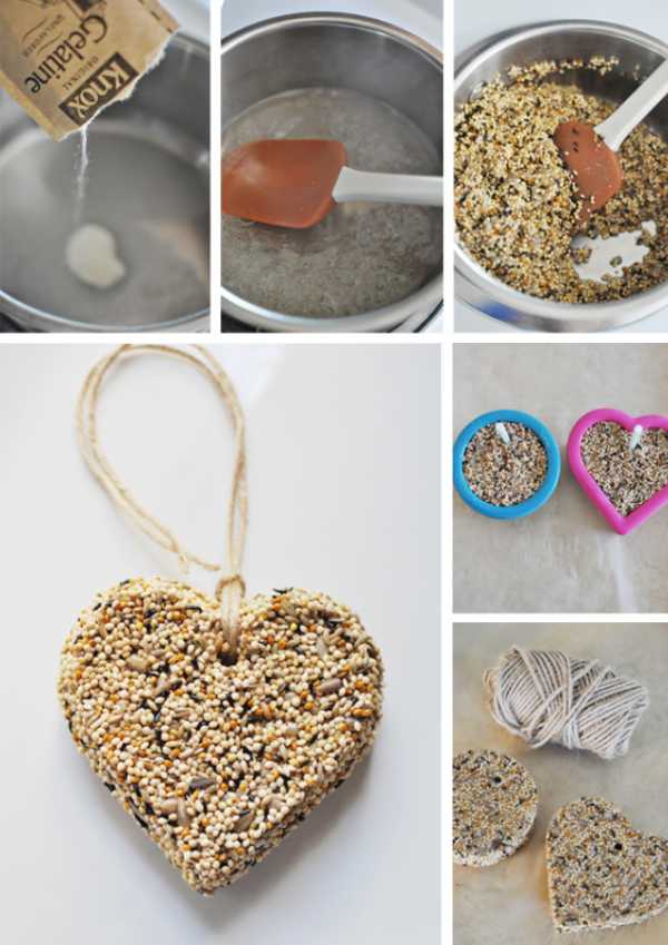 Такую кормушку можно изготовить из различных злаковых и желатина. Для этого вам понадобиться желатин, который нужно растворить на водяной бане, насыпать в него зерно, чтобы получилась густая масса, разложить по формочкам (можно использовать небольшие формы для выпечки или подсвечники), не забыв положить туда и нитки, за которые можно будет подвесить кормушку к дереву, и отправить в холодильник для застывания. Для удобства, можно также сделать небольшое отверстие в приготовленной массе, через которое будет продеваться нитка для подвешивания кормушки.