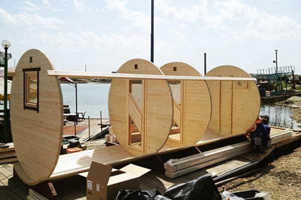 Наиболее компактные сооружения кругловидной формы имеют длину 2 м. Конструкция такой постройки предполагает наличие всего 2 помещений. Раздеваться необходимо у входа. Будет удобнее, если строение имеет крыльцо с козырьком. Обычный вес постройки не превышает 1,5 т. Кроме компактных конструкций, существуют и более габаритные бани-бочки — Их длина составляет 6 м.