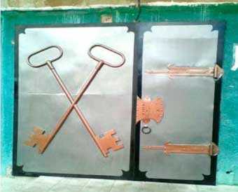Заменил старые деревянные ворота в мастерской отца новыми металлическими с дверью и украсил металлическими ключами с имитацией старины.