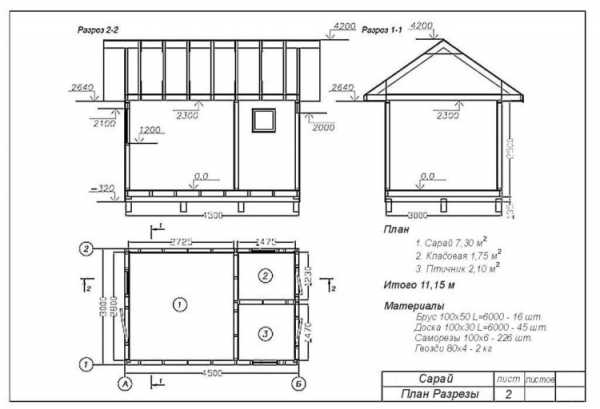 Точно определившись с размерами и функциями будущего сарая, обдумайте план работ. Нарисуйте очень подробный чертеж, схему (желательно вместе с членами семьи, чтоб избежать конфликтов в будущем). Весь процесс черчения сопровождайте записками Например: черновой пол – доска необрезная 3000 х 250 х 40 мм 10 шт (3 шт есть), 0,5 кг гвоздей 100 мм (есть), 1 л биозащиты, топор (есть), молоток (есть), электролобзик (есть), пилки дерево 2 шт, кисть 50 мм). Сведя потом воедино все свои записи, Вы получите полный список инструментов и материалов, которые нужно докупить, а также того, что уже есть и что покупать не надо. И в магазин придется сходить всего раз пять вместо двадцати.