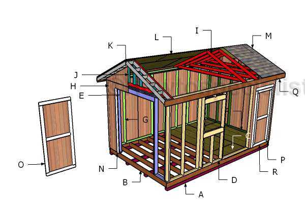 Рама пола и внутренние балки сделаны из обработанных под давлением досок 2×6 (50.8 х 152.4 мм), подрезанные по мере необходимости. Чтобы пол сарая не провисал, автор удвоил внешние доски для повышения прочности и жесткости. Там, где плиты прикреплены непосредственно к стоякам, использовались 8-ми см оцинкованные болты диаметром 8 мм, прикрепленные к предварительно просверленным отверстиям.