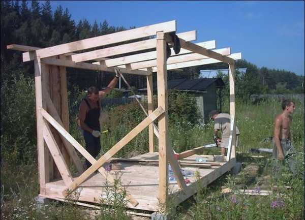 Если передние стойки сделать более высокими, то можно обойтись и без них. В этом случае крыша получится односкатная. Ее соорудить проще.
