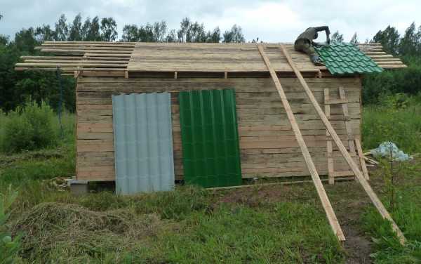 После создания стен можно делать кровельную обрешетку. Для этого потребуются крепкие рейки, которые нужно хорошо закрепить на стенах. Как кровельный материал, хорошо подойдет металлочерепица, которая является дорогим, но качественным и долговечным материалом.