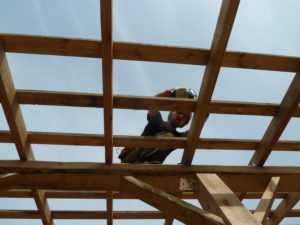 Для быстрой постройки сарая своими руками, не следует использовать сложную стропильную систему. Для начала можно сделать обычный сарай, накрытый односкатной крышей. Чтобы построить такую конструкцию, стойки передней стены делаются более высокими, чем задней. Балки-стропила закрепляются на стойках и скрепляются стандартной обрешеткой, сделанной из необрезных досок. Доски предпочтительно крепить сплошным настилом, чтобы рубероид мог прослужить дольше. Готовый каркас обшивается досками.