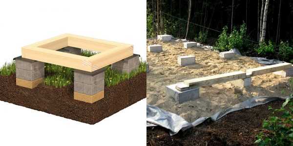 Плюс такого решения не только в быстроте сооружения основания и минимальных затратах по материалам. Так как для обвязки используется брус, то есть дерево, то установить на нем своими руками стойки каркаса особого труда не составит. Да и сарай можно несколько приподнять над грунтом, даже выровнять конструкцию, если участок идет под уклон.
