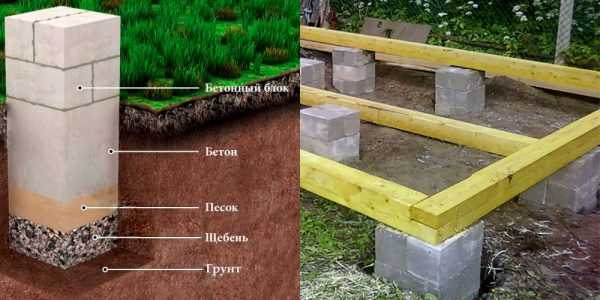 Вариантов также несколько – ЖБИ, металлические опоры с пластинами, кирпичи и так далее. Автор не стал рассматривать иные технологии лишь по одной причине – сложность соединений. Опорная рама – из древесины, столбики – из других материалов. Своими руками сочленить можно, но зачем усложнять себе жизнь поисками перфоратора, буров по бетону, крупных сверл по металлу или чего-то еще.