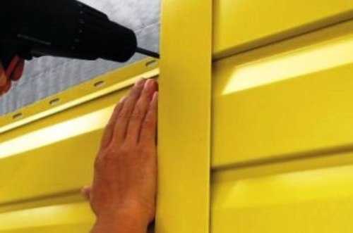 Процесс укрепления сайдингаШаг обрешетки выдерживают в пределах 30-40 см. Монтаж самих панелей не представляет сложности. Их укладывают одна на другую, до щечка, прикрепляя к обрешетке саморезами. В конце устанавливается финишная планка. В процессе работы, планки проверяются по уровню через каждые 4-6 рядов.