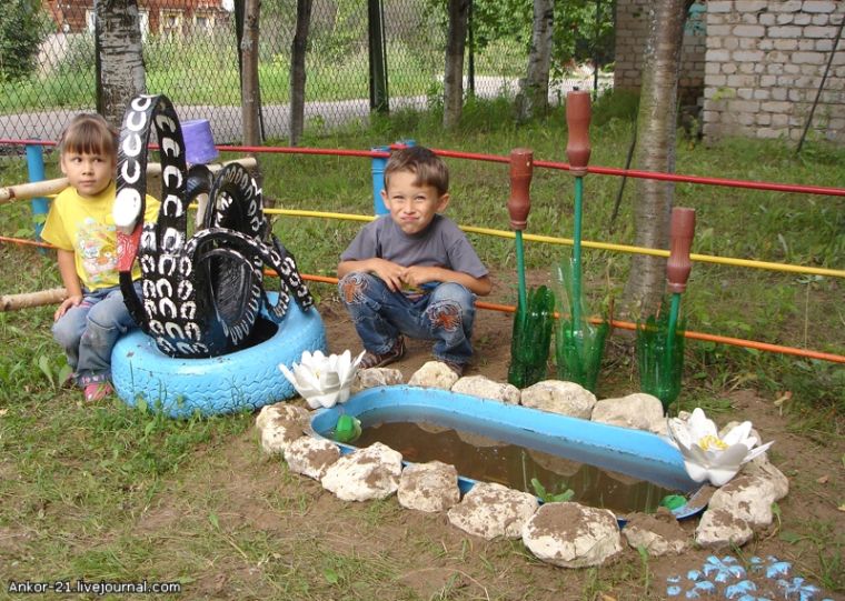 Прежде всего – это старые покрышки. В настоящее время использованные шины буквально обретают новую жизнь – из них делают клумбы, качели и самые разнообразные поделки на детскую площадку.![]()