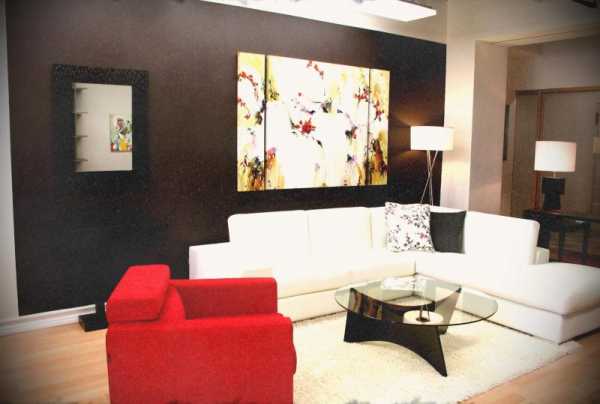 - Энергичную и темпераментную атмосферу помещению зададут глянцевые полотна картин с абстрактными изображениями.