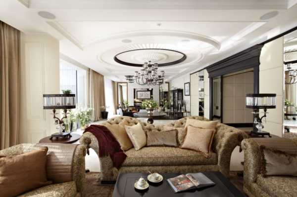Здесь могут соседствовать хрустальные люстры и керамические плафоны, канделябры и точечные светильники. Практикуется многоуровневое освещение.