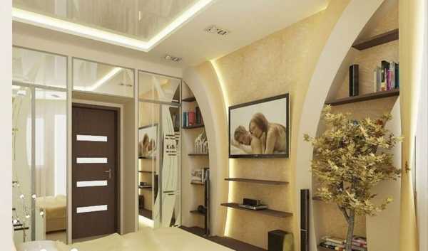 Стена, декорированная гипсокартоном, может иметь встроенные ниши, предназначенные для размещения бытовой техники, книг, аквариума. ГПК панели позволяют хорошо замаскировать коммуникации. Достоинство фальшстены в том, что ее можно моделировать по собственному желанию: создавать изгибы, арочные переходы, монтировать подвесные конструкции.