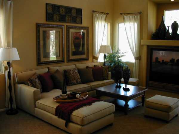 Важно определиться, на чем будет сделан акцент в интерьере. Если у Вас в гостиной роскошная новая мебель, то целесообразнее будет сконцентрировать внимание гостей именно на ней.