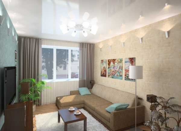 В данном случае применяют светлую палитру для стен, а в тон к основному цвету помещения подбирают легкие струящиеся шторы. Центральную люстру дополняют точечной подсветкой.