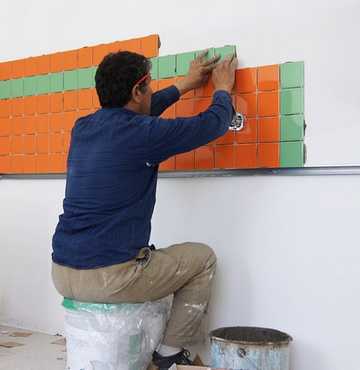 Если выбирается вариант «клей на стену», то смесь кладется на тот участок, где будет плитка. Клей нужно равномерно распределить по участку, «прочесать» кромкой шпателя и приклеить к стене увлажненную плитку.
