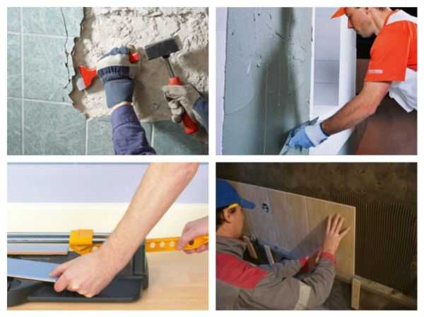 На фото основные этапы подготовки перед укладкой настенной плитки: демонтаж старой облицовки и выравнивание стенМонтаж плитки