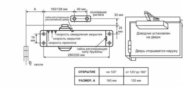 От того, как установлен прибор, зависит угол открытия двери. Он может составлять 180, 120 или 90 градусов. Инструкция, идущая к коробке с устройством, указывает все размеры для каждого типа установки, расстояния от верхнего края и угла полотна до тела доводчика, расстояния от края коробки до крепежной лапки рычага тяги и другие.