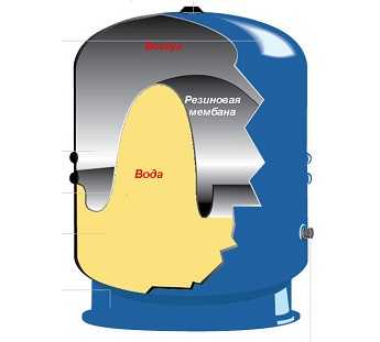 Гидроаккумулятор — это бак из листового металла поделенный на две части эластичной мембраной. Мембрана бывает двух видов — диафрагмы и баллона (груши). Диафрагма крепится поперек бака, баллон в виде груши закрепляют на входе вокруг входного патрубка.