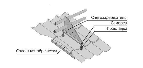 - снегозадержатель на крышу из профнастила крепится в расчете на значительное усилие, значит, необходимо обеспечить его монтаж к несущей части конструкции под кровлей;