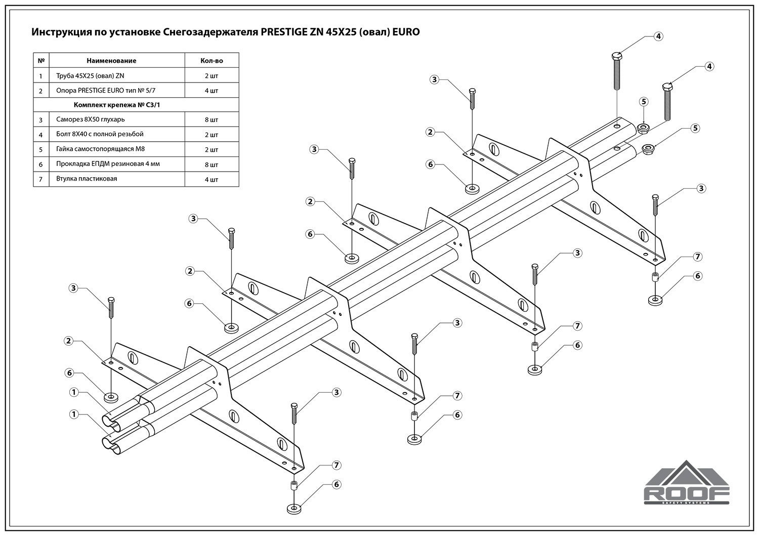 Трубчатые снегозадержатели крепятся в следующем порядке: