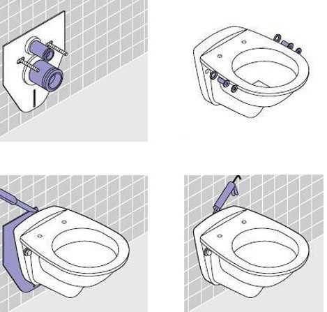 Производители сантехники предлагают навешивать подвесную сантехнику (это не только унитазы, но и биде, писсуары и даже умывальники) на специальные рамы-инсталляции со встроенным бачком и всеми необходимыми деталями для подключения коммуникаций и надёжного крепления. Предварительная установка инсталляции унитаза позволит выполнить монтаж унитаза быстро, аккуратно и скрыть коммуникации, не прибегая к штроблению стен.