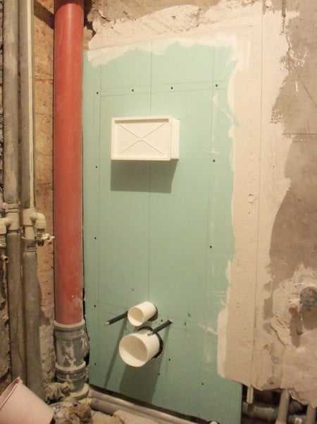 Если всё сделано правильно, инсталляция выставлена строго по уровню, в бачке и прилегающих трубопроводах не обнаружено подтечек, то можно приступать к отделочным работам. Выравнивают стену при помощи двух листов влагостойкого гипсокартона. В таких изделиях необходимо сделать несколько отверстий под сантехнику. Их вырезают по шаблону, который идёт в комплектации оборудования.