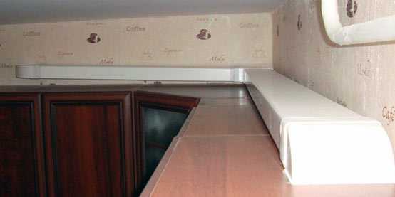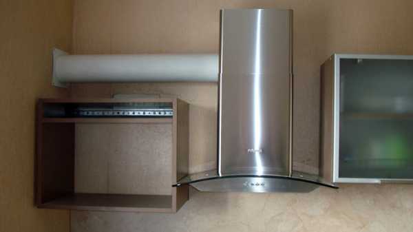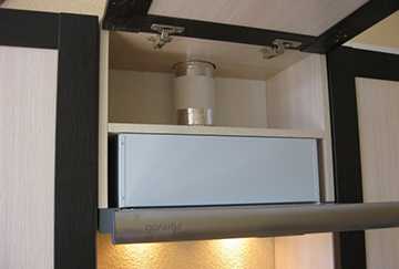- Для удобства установите корпус на настенный шкаф над плитой. Потом закрепите его более плотно, заделав все щели монтажной пеной и приклеив к шкафу, во избежание резонанса.